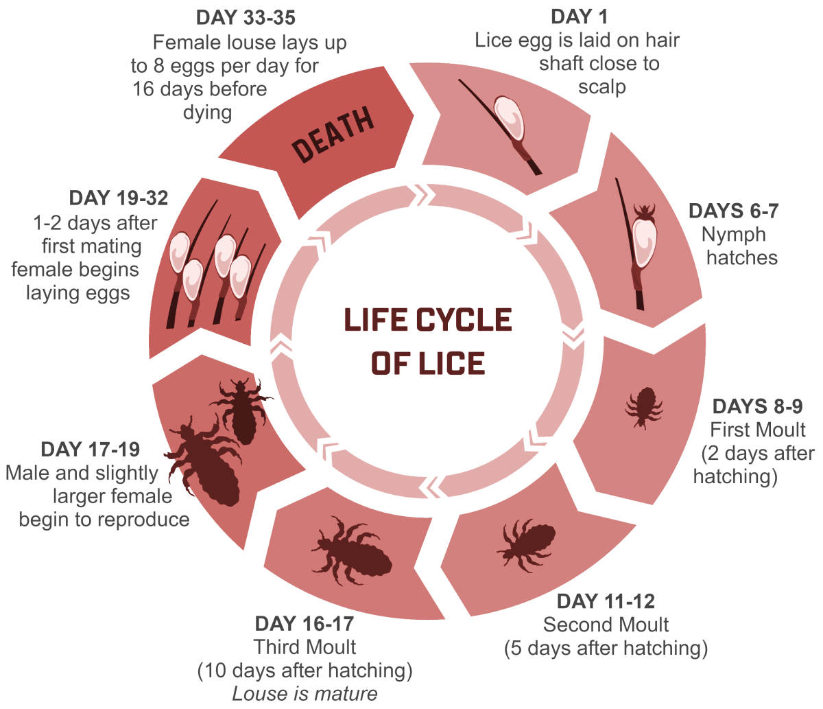 What is the lifecycle of head lice? Nits take six to seven days to hatch into nymphs. Nymphs are immature lice that moult three times over ten days, during the process of maturation. The mature lice mate, and after an additional one to two days, the female louse starts laying her eggs. The adult female only needs to be fertilized once, after which she will lay eggs twice a day, four or five at a time, for the rest of her life. Adult lice live for 16 days, for a total lifespan of about 35 days. Once off the host, for example on pillows or bedding, they generally die within 24 hours. Use this chart to estimate the age of a lice infestation.